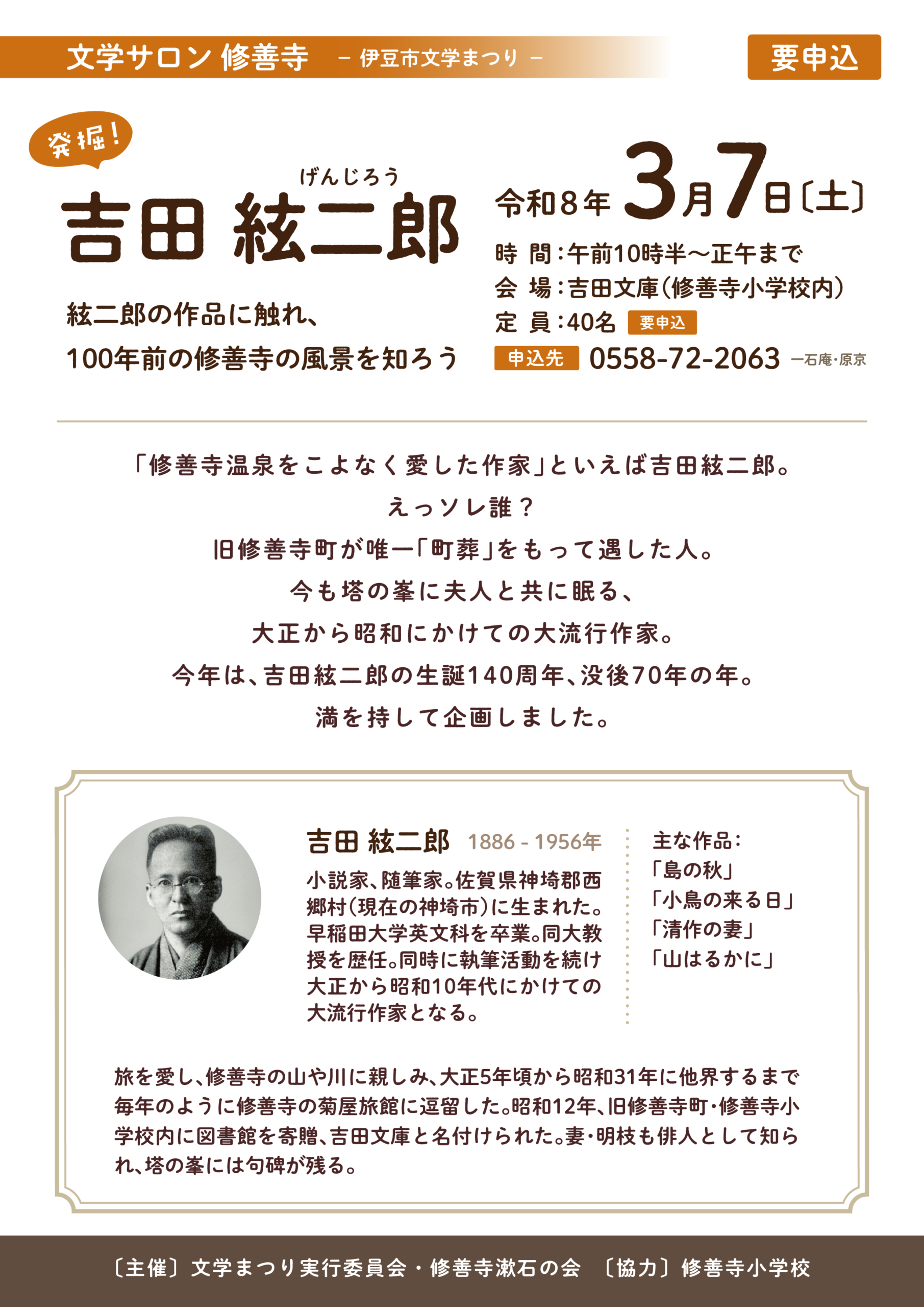 旧修善寺町が唯一「町葬」をもって遇した人。今も塔の峯に夫人と共に眠る、 大正から昭和にかけての大流行作家。 今年は、吉田絃二郎の生誕140周年、没後70年の年。 満を持して企画しました。